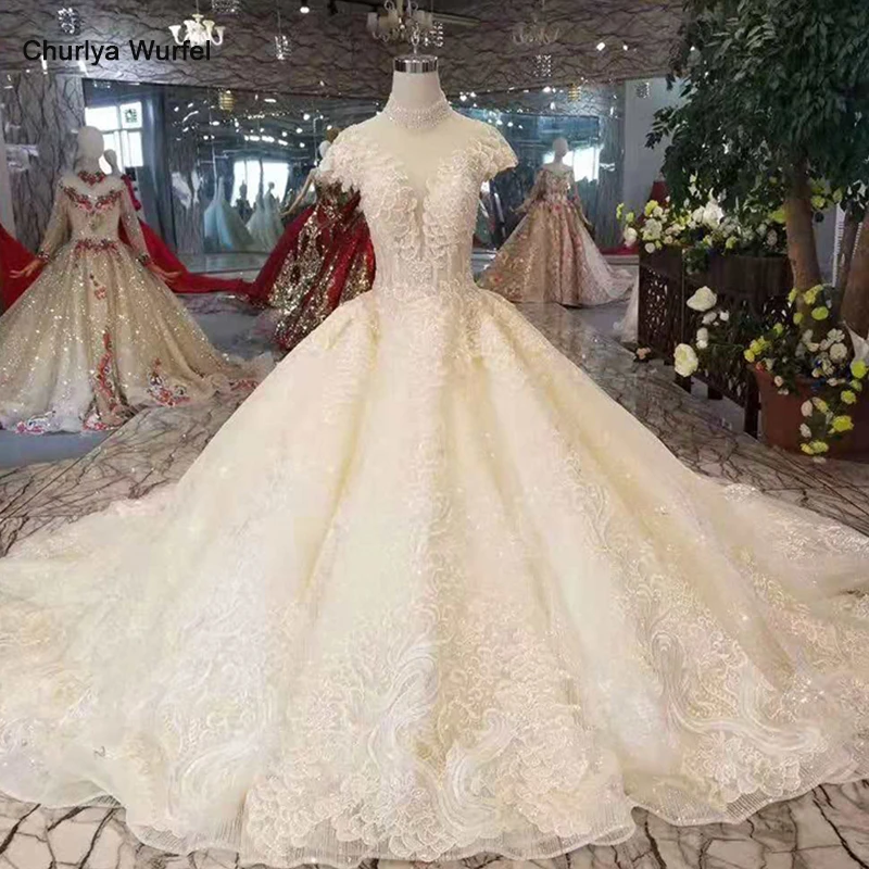 Elegant High End Champagne Wedding Dresses 2020 Ball Gown Glitter Lace Flower High Neck 3 4 Sleeve Royal Train