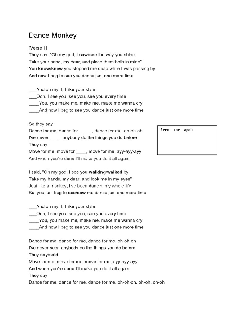 Dance Monkey Lyrics English Esl Worksheets For Distance Learning And Physical Classrooms
